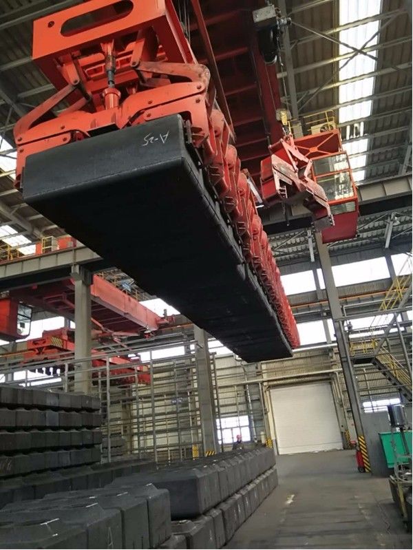 本产品通过自动夹钳,每次可夹取21块阳极碳块,***高可堆成8层。桥架下面装有工字钢,工字钢上装有5t电动葫芦,该葫芦沿工字钢运行,可通过单块自动碳块夹钳夹取碳块,还可在车间吊运零星杂物。运行和起升全部采用变频调速,全部操作均可在操纵室内完成。采用机械重力式自动夹取代替气动方式夹取碳块,为制造厂和用户大大节约了成本。